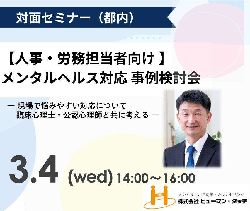 新着情報 2026.02.05 ■3月4日(水)【人事・労務担当者向け メンタルヘルス対応 事例検討会(対面開催)】開催! ― 現場で悩みやすい対応について臨床心理師・公認心理士と共に考える ― 一覧を見る